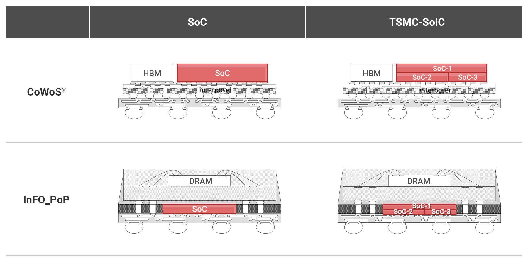 不同于传统的平面封装,SoIC 是一种 3D 封装解决方案,支持将多个芯片(Die)在垂直和水平方向上进行堆叠,最终集成为一个类似 SoC 的整体。