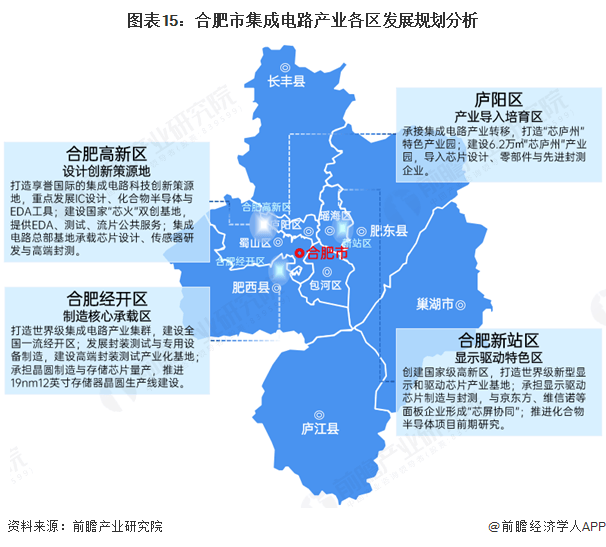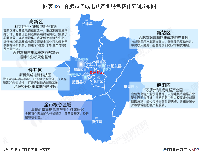 合肥各区域集成电路产业载体围绕全市“芯屏汽合”战略布局,形成了以高新区、经开区、新站高新区为核心,其他区域配套补充的格局。高新区整体产业链完整,拥有总部基地和“芯火”双创基地;经开区聚焦制造与装备,依托空港科技园承载晶圆制造;新站区侧重封测与材料协同,服务新型显示产业。庐阳区“芯庐州”产业园2024年投用,标志产业布局向中心城区延伸。