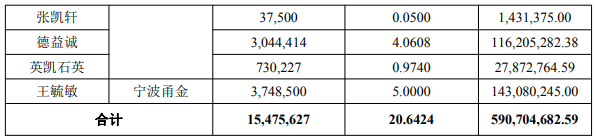 据江丰电子公告,为深化产业结构布局,顺应半导体零部件行业未来发展趋势及满足区域市场需求,进一步增强公司核心竞争力,江丰电子及其全资子公司宁波江丰博鑫科技有限公司(以下简称“江丰博鑫”)担任执行事务合伙人的宁波甬金智享企业管理咨询合伙企业(有限合伙)(以下简称“宁波甬金”,江丰电子与宁波甬金合称为“受让方”)拟以现金人民币59,070.47万元协议收购张忠恕、王毓敏、张凯轩、北京德益诚投资发展中心(有限合伙)(以下简称“德益诚”)、北京英凯石英投资发展中心(有限合伙)(以下简称“英凯石英”,张忠恕、王毓敏、张凯轩、德益诚与英凯石英合称为“转让方”)合计持有的北京凯德石英股份有限公司(以下简称“凯德石英”或“标的公司”)15,475,627股股份(以下称为“标的股份”),占凯德石英的股权比例为20.6424%。本次交易标的股份的每股转让价格为38.17元。