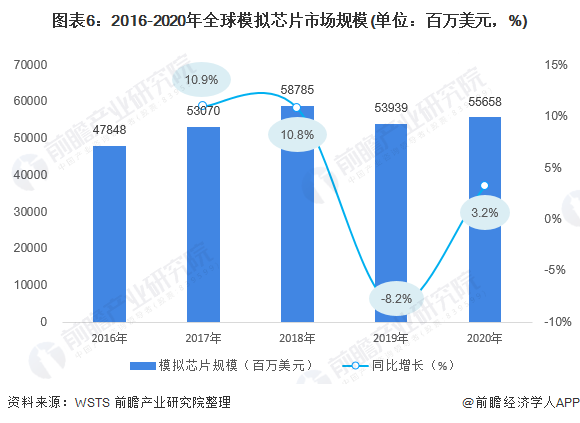 模拟芯片是信号处理必不可少的一环,2016-2020年全球模拟芯片市场规模总体波动变化。根据WSTS最新数据显示,2020年全球模拟芯片市场有所好转,全球模拟芯片市场规模为556.58亿美元,同比增加3.2%。