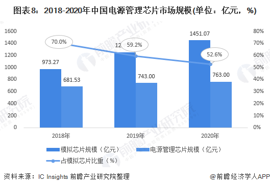 2018-2020年中国模拟芯片市场规模不断增加,2020年模拟芯片业务市场规模约1451.07亿元,占当年中国集成电路规模的16.4%。电源管理芯片作为模拟芯片的重要细分领域,初步统计2020年业务规模763亿元,占模拟芯片市场规模的50%以上。