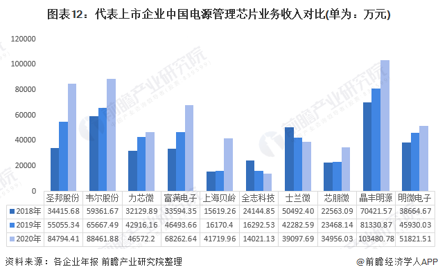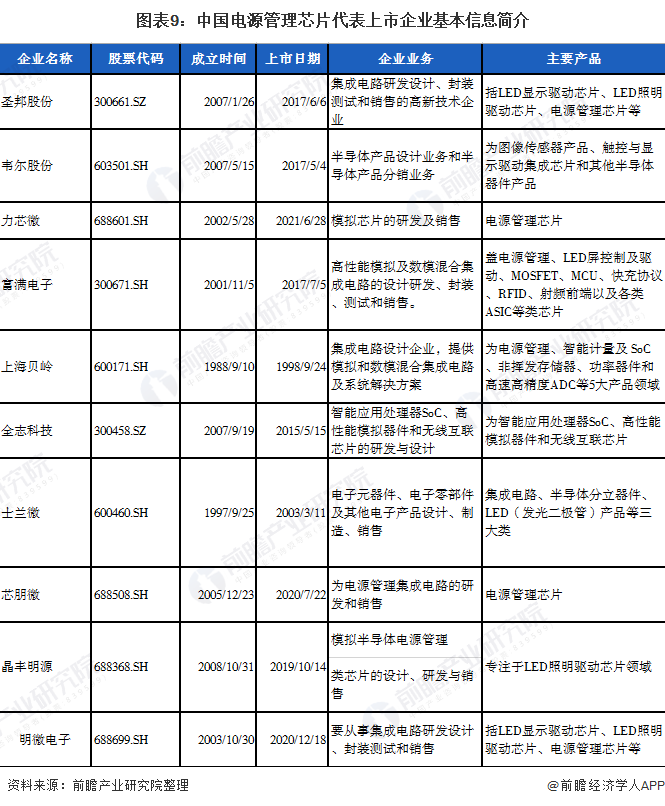 目前,我国多家企业参与电源管理芯片业务的发展,企业多在2000年初成立,2017年经历了一个上市高潮期,圣邦股份、韦尔股份、富满电子等均在2017年获得上市,另外代表企业芯朋微、力芯微、明微电子等也于2020、2021年纷纷上市。表明国内电源管理芯片企业市场地位、市场认可度及竞争力不断提升。