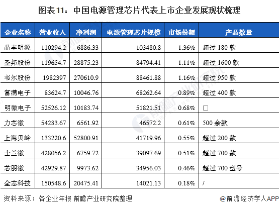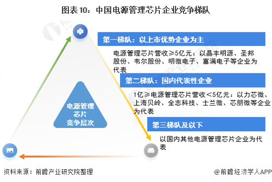 目前,我国圣邦股份、韦尔股份、力芯微、富满电子、上海贝岭、全志科技、士兰微、芯朋微、晶丰明源、智光电气十大企业成为国内电源管理芯片的头部优势企业,其中以晶丰明源、圣邦股份、韦尔股份、明微电子及富满电子几大企业电源管理芯片业务营收超过5亿元,处在国内该领域企业的第一梯队,竞争优势不断凸显。