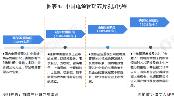 2000年以前国内电源管理芯片行业处于萌芽发展阶段,该阶段企业多以中外合资公司为主,布局电源管理芯片业务。2000-2008年随着中国通信及工业等的而发展,国内以圣邦股份、韦尔股份等为代表的优势企业纷纷成立,国内电源管理芯片起步发展。至2017年受优势企业在电源管理芯片领域研发投入及技术积累的不断增加,进入市场的发展阶段,企业的重视程度、市场竞争力不断增加,部分企业上市发展。2018年中美贸易摩擦及芯片“卡脖子”的制约增加了我国各领域对芯片研发及自主生产能力的重视,电源管理芯片国产替代化推进行业进入快速拓展阶段。