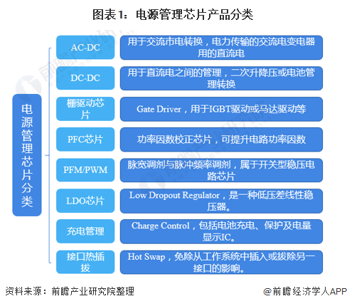 电源管理芯片同步电子产品技术和应用领域升级,产品种类繁多。主要类型包括:电源管理、AD/DC、DCDC、锂电池充电管理芯片、CPU电源监测电路、负载开关、LED驱动器等。广泛应用于手机与通讯、消费类电子、工业控制、医疗仪器、汽车电子等应用领域,随着物联网、新能源、人工智能、机器人等新兴应用领域的发展,电源管理芯片下游市场持续发展。