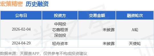 证券之星消息,根据天眼查APP于2月4日公布的信息整理,深圳宏策精密光学技术有限公司A轮融资,融资额未披露,参与投资的机构包括中网投,芯鑫租赁,深创投。