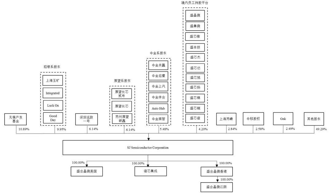 IPO前,盛合晶微第一大股东无锡产发基金持股比例为10.89%,第二大股东招银系股东合计控制盛合晶微的股权比例为9.95%,第三大股东深圳远致一号持股比例为6.14%,第四大股东厚望系股东合计持股比例为6.14%,第五大股东中金系股东合计持股比例为5.48%。
