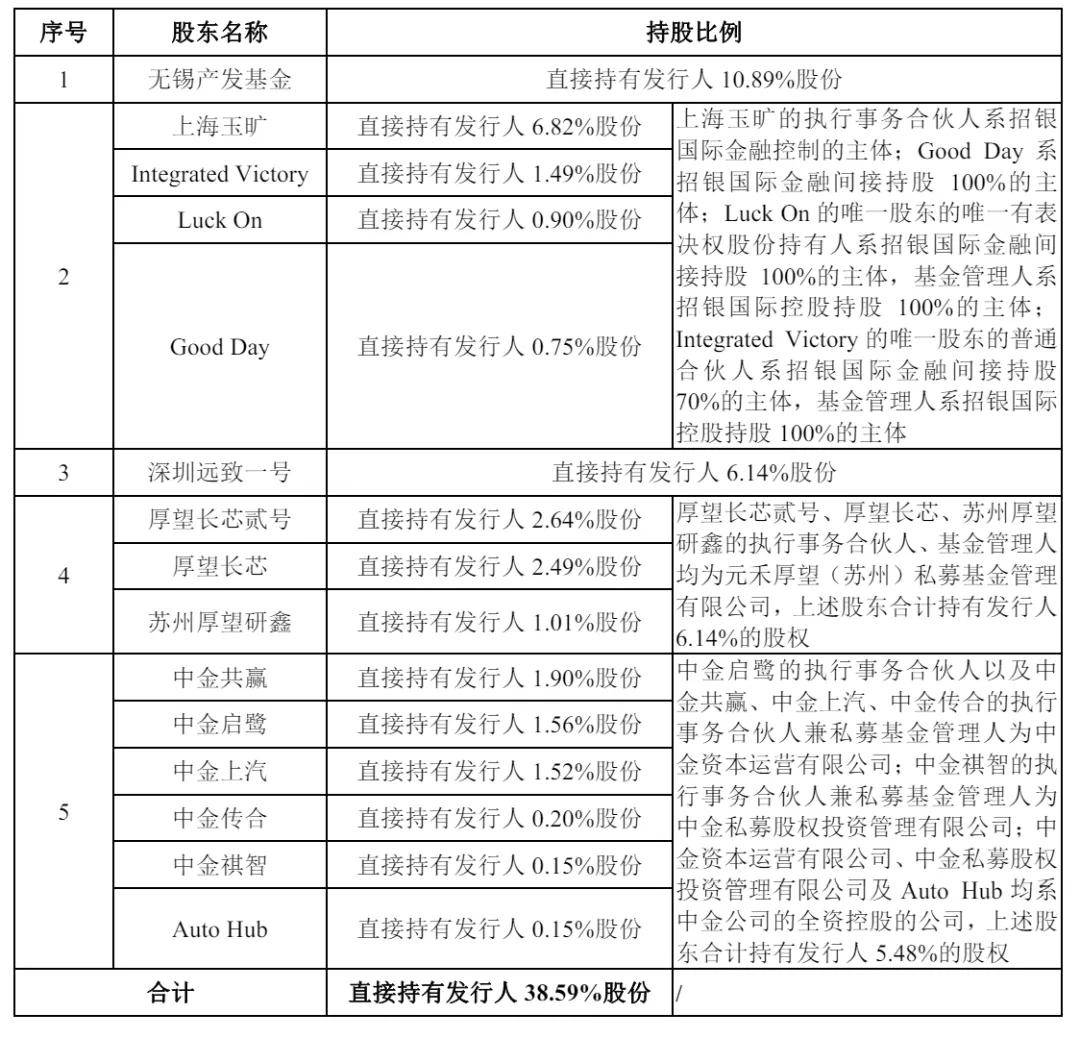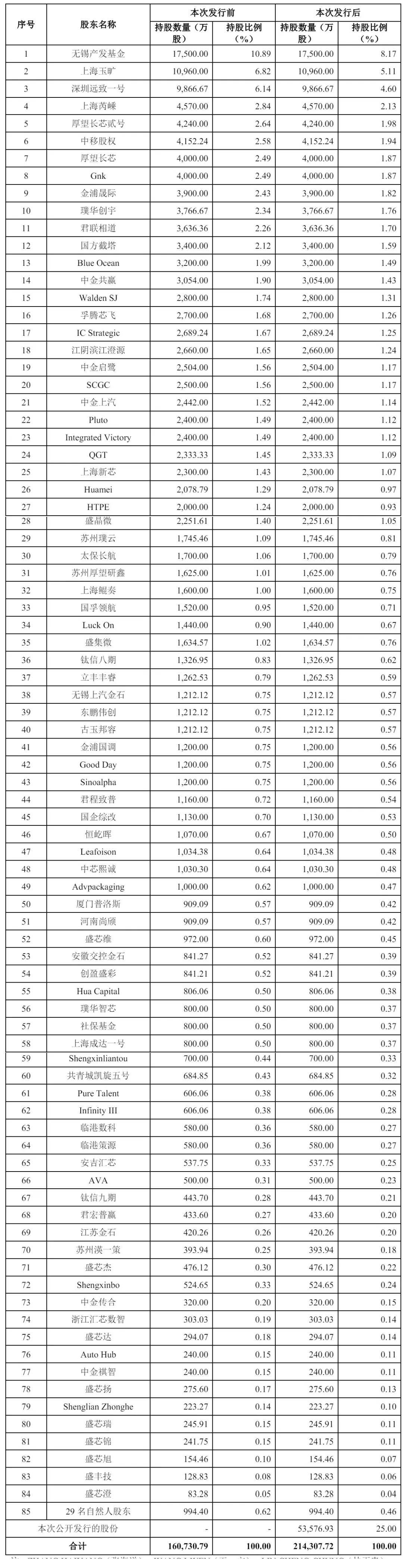 IPO后,无锡产发基金持股为8.17%,上海玉旷持股为5.11%,深圳远致一号持股为4.6%,上海芮嵊持股为2.13%,厚望长芯贰号持股为1.98%,中移股权持股为1.94%,厚望长芯、Gnk分别持股为1.87%,金浦晟际持股为1.82%,璞华创宇持股为1.76%,君联相道持股为1.7%,国方截塔持股为1.59%,Blue Ocean持股为1.49%;