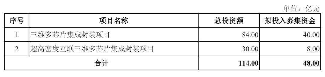 盛合晶微计划募资48亿元,其中,40亿元用于三维多芯片集成封装项目,8亿元用于超高密度互联三维多芯片集成封装项目。