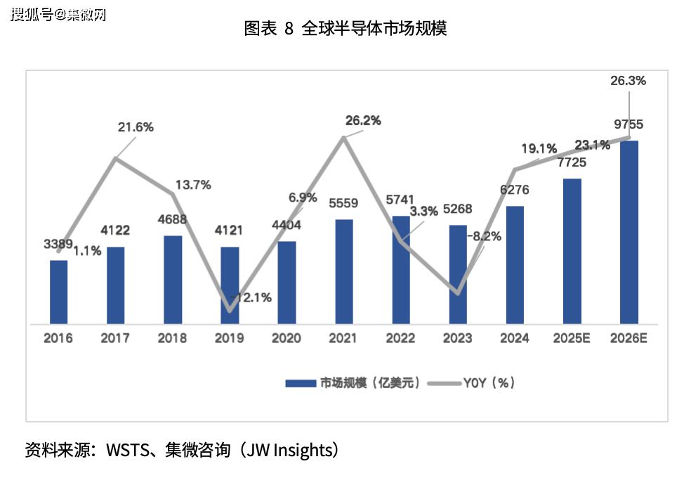 根据 WSTS 数据,全球半导体市场规模在 2016至2024年期间由3389 亿美元提升至 6276 亿美元,复合增长率为8.03%。近年来,人工智能浪潮下大模型的快速发展推动了智算中心及边缘端、终端等应用场景需求不断增长,2025 年全球半导体市场规模预计同比增长 23.0%,有望达到 7725 亿美元。2026 年全球半导体市场规模将突破 9755 亿美元,同比增长超 25%,逼近万亿美元大关。