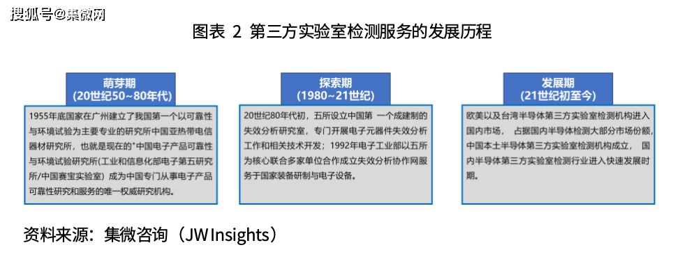 中国大陆半导体第三方实验室服务的发展历程主要可以划分为3个阶段。20世纪50-80年代,1955年底中国亚热带电器器材研究所在广州成立,即现在的赛宝实验室;20世纪80年代初,五所成立中国第一个成建制的失效分析实验室,专门开展电子元器件失效分析工作和相关技术开发;21世纪初开始,欧美、中国台湾地区等第三方检测机构进入中国大陆市场,并占据中国半导体检测大部分市场份额,中国本土民营第三方检测机构也开始诞生发展,本土半导体第三方实验室服务机构成立,国内半导体第三方实验室服务行业进入快速发展时期。