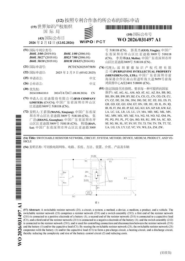 证券之星消息,根据企查查数据显示比亚迪(002594)公布了一项国际专利申请,专利名为“可切换电阻网络、电路、系统、方法、装置、介质、产品及车辆”,专利申请号为PCT/CN2025/075850,国际公布日为2026年2月12日。
